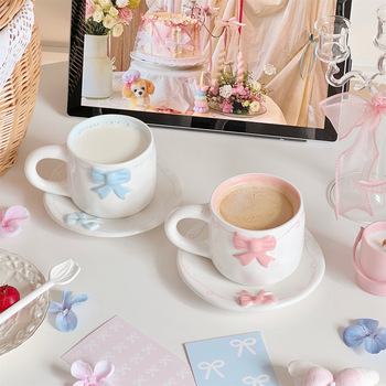 Lelyi Ins Cute Girl Heart Bow Taza de cerámica y platillo Taza de café dibujada a mano más vendida creativa