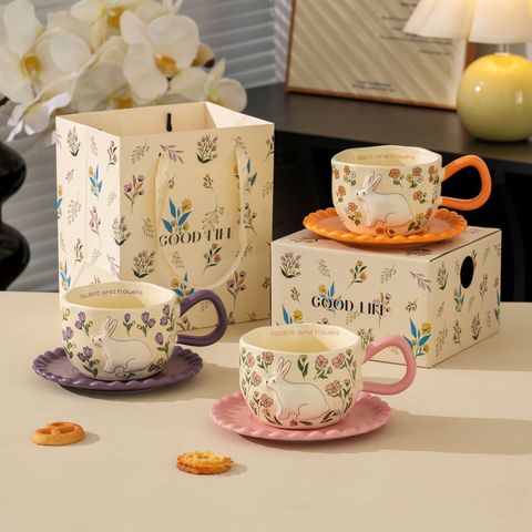 Lelyi Ins-style Cute Handmade Rabbit Embossed Coffee Cup and Saucer High-quality Creative Fresh Ceramic Mug